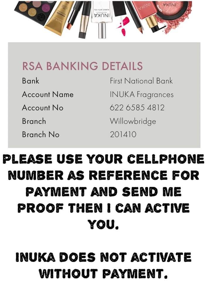 ✅ Add R180 for courier if you are not in Cape Town (Inuka will gift you with a perfume that you can sell for R260) if you’re in RSA.